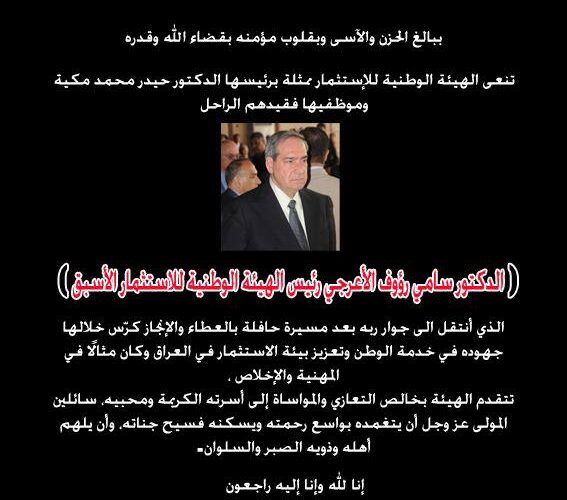 🔳 الهيئة الوطنية للاستثمار تودع فقيدها الراحل الدكتور سامي روؤف الاعرجي الى مأواه الاخير